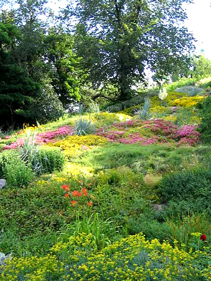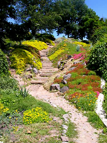 „Гірка декоратиних сукулентів” розташованоа на південному схилі висотою 15 м, на вершині якої штучно насипаний пагорб висотою 2,5 м, що збільшує враження гористого характеру рельєфу. Декоративність ділянки забезпечується не тільки рельєфом, а також поєднанням зелених насаджень, кам’яного розсипу, формами окремих каменів, сходинок та кам’яних лав, альтанки та квітучих квітниково-декоративних рослин.